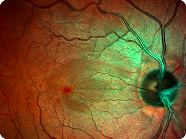 Uses three laser wavelengths simultaneously to provide diagnostic images that show distinct structures at different depths within the retina.